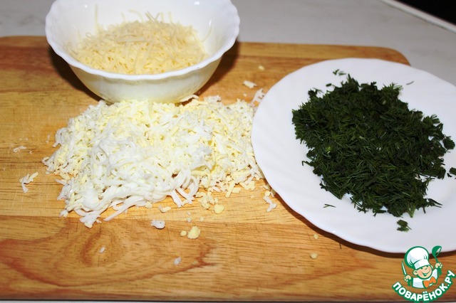 Натереть на мелкой терке сыр и яйцо, петрушку измельчить.