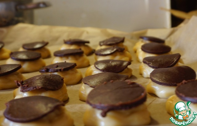 Выкладываем их сверху на профитроли. Отправляем в духовку при температуре 170 градусов на 20 минут. Потом уменьшаем температуру до 160 градусов и выпекаем профитроли еще 20 минут.