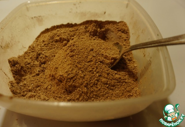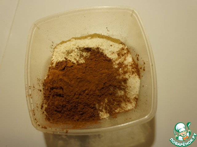 Следующий этап – приготовление штрейзеля. Соединяем муку, сахар, щепотку соли, какао.