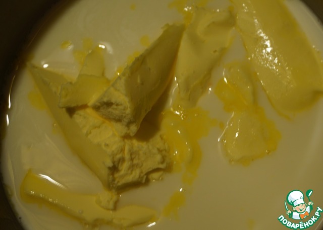 Теперь очередь заварного теста. Соединяем воду и молоко, добавляем щепотку соли и сливочное масло. Ставим на огонь.