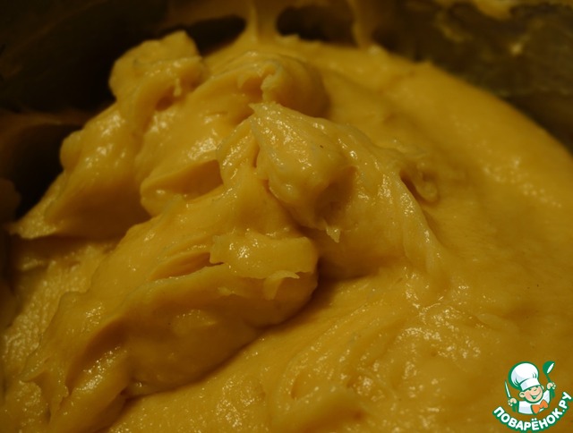 Немного охлаждаем тесто и вбиваем по одному 4 яйца. Если яйца мелкие, то может понадобится 5 яиц. После добавления каждого яйца, хорошо перемешиваем тесто до гладкости.
