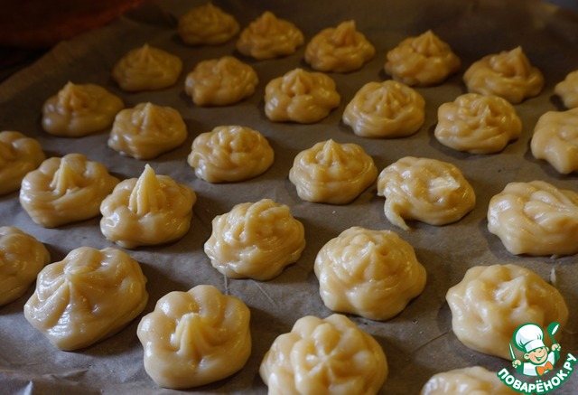 Отсаживаем на противень пирожные диаметром около 3 см. В процессе выпечки они увеличатся до 5 см в диаметре.