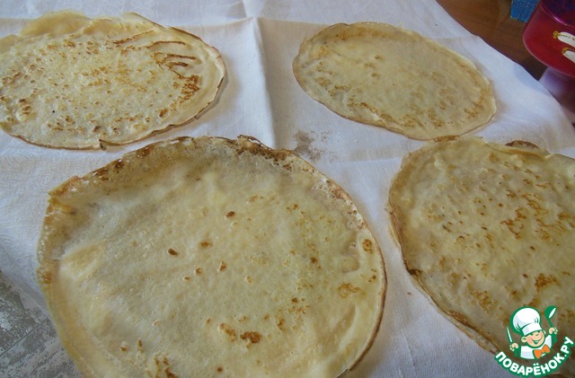 Выпекаем тоненькие блинчики по любимому Вами рецепту.