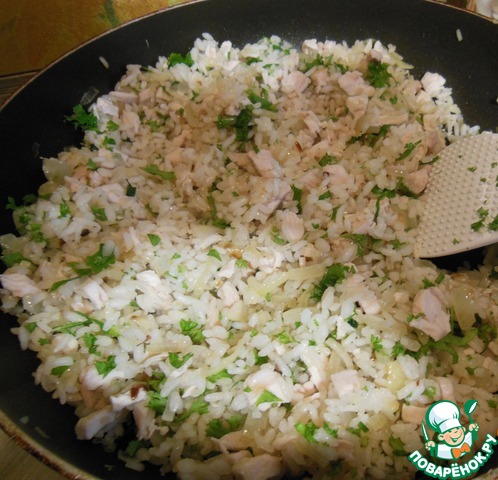Готовим начинку:лук обжарить. Отварить рис, сварить и нарезать куриную грудку. Смешать ингредиенты. Добавить зелень петрушки и укропа.