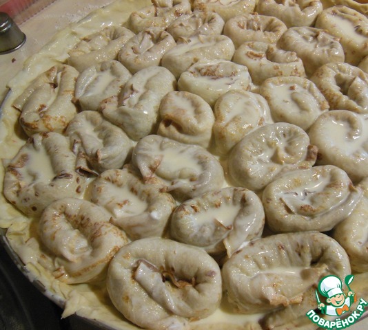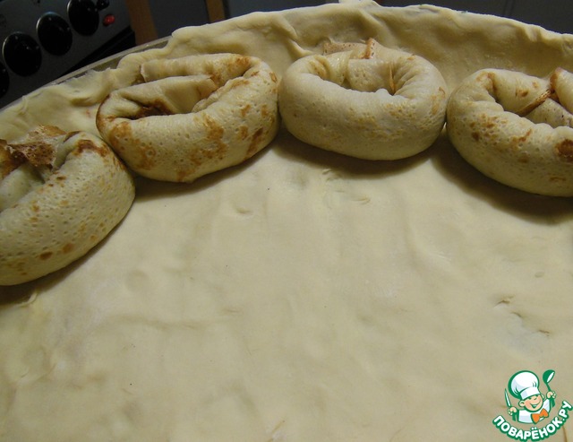 Тонко!!! раскатываем половину теста. Укладываем в форму, сформировав бортики. Блинчики фаршируем, сворачиваем трубочкой, затем – улиткой.