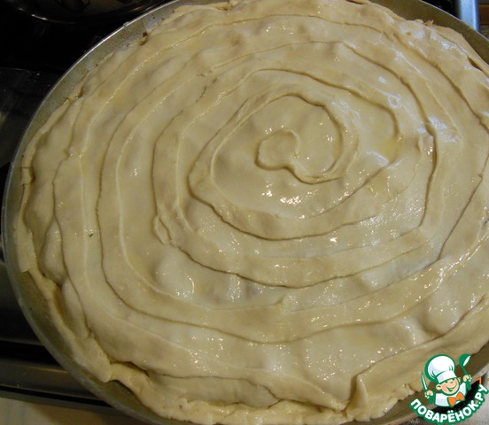 Сверху накрываем пирог второй частью теста. Смазываем пирог желтком.