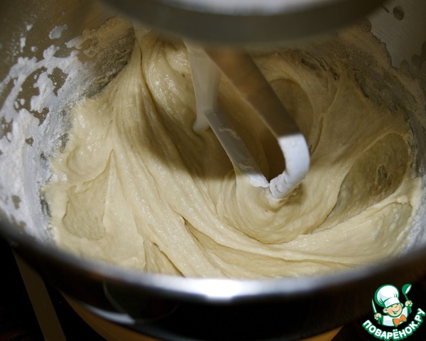 В чаше стационарного миксера (используя насадку "лист") начать смешивать все ингредиенты для теста. ВАЖНО, чтобы все ингредиенты были комнатной температуры! Выложить опару и добавить яйцо, начать перемешивать. Не переставая мешать, влить постепенно молоко, добавить сахар и соль. Сразу оговорюсь, по рецепту в состав теста входят два типа муки, обыкновенная мука для выпечки (в ингредиентах из-за программы мне пришлось указать ее как "мука блинная"...) и мука Манитоба! Муку Мантоба используют в выпечке, требующей длительной расстойки. (если у Вас нет муки Манитоба, просто замените её на Вашу любимую привычную муку). Оба типа муки просеять и добавить частями в чашу миксера. В самом конце вымешивания сменить насадку миксера на "крюк" и добавлять в тесто по кусочку размягченное сливочное масло. Не кладем новый кусочек масла, если предыдущий еще не был окончательно вмешан в тесто.