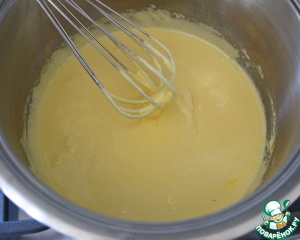 На следующий день перед выпечкой коржа приготовить заварной крем... Молоко подогреть и в горячее молоко положить стручок ванили (семена и сам стручок!) на полчаса. Дать молоку остыть. Отделить желтки от белков (один белок сохранить для смазывания коржа). Растереть желтки с сахаром. Просеять муку, добавить к яйцам и размешать до однородности, чтобы не было комочков. Из молока удалить ванильный стручок и влить в желтки. Размешать и перелить в кастрюльку. Поставить на слабый огонь и варить заварной крем до загустения, до готовности, постоянно помешивая. Немногим ранее замочить листовой желатин в холодной воде на 10 минут. Затем как следует отжать его от лишней жидкости. Добавить в готовый заварной крем желатин и как следует размешать.