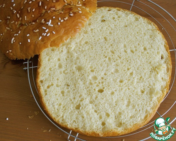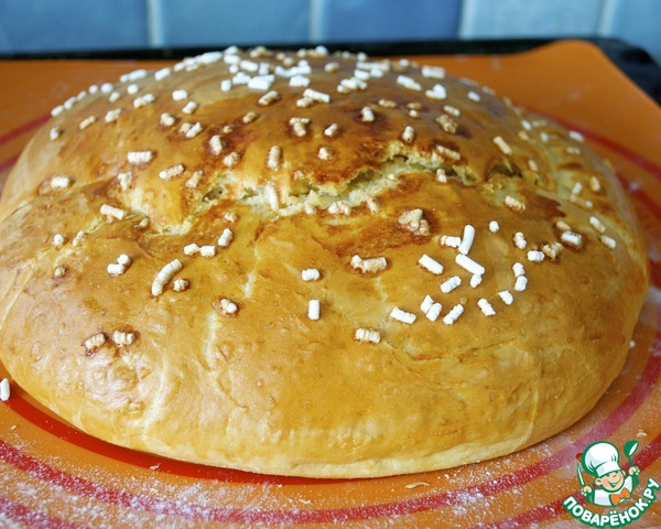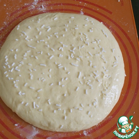 По истечении указанного времени смазать поверхность "коржа" яичным белком и присыпать декоративным (гранулированным) сахаром. Поставить в разогретую до 160 С духовку и выпекать корж 50 минут. Если за это время верх начнет сильно темнеть, прикрыть листом фольги.