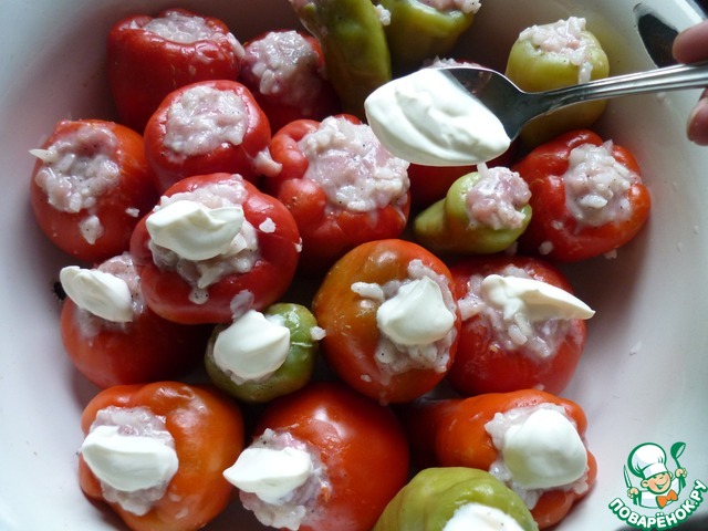 Фаршируем перцы и помидоры сверху смазываем сметаной