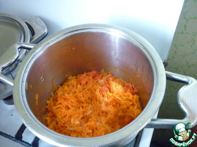 Лук режем кубиками. Отправляем в горячее масло, в это время натираем морковь на крупной терке, через пару минут добавляем мякоть помидор, жарим минут 10
