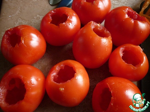 Подготовить помидоры. Люблю небольшие помидорки (их больше влезет) стараюсь брать примерное равное количество помидор и перцев. Выколупываем серединки маленькой кофейной ложечкой, ну или как я обратной стороной чайной ложки. мякоть помидор нам еще пригодится.