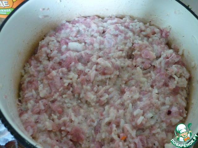Отвариваем стакан риса в двух стаканах воды, можно не до полной готовности. Остужаем, добавляем его в фарш, мелко режем одну луковицу, добавляем в фарш, добавить яйцо, посолить, поперчить. можно в фарш добавить немного молока или сметаны, чтобы он был немного жидковат, так в готовом виде он будет более нежным
