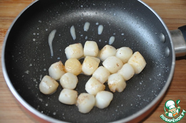 Промокаем гребешок бумажным полотенцем, посыпаем солью, сахаром и обжариваем на сливочном масле до "золотистого" оттенка (по 1 мин. с обеих сторон).