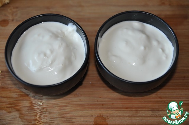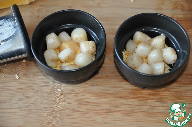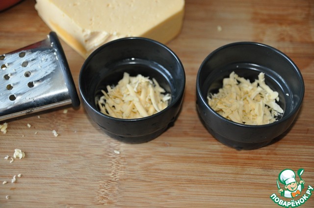 Берём кокотницы, у меня рамекины, на дно кладём половину количества тёртого твёрдого сыра.