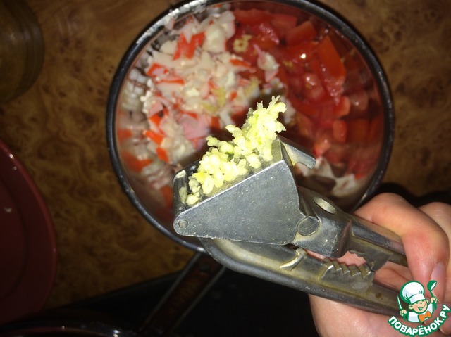 Чеснок давим через "чеснокодавилку" или мелко мелко режем. Добавляем к вышеуказанному