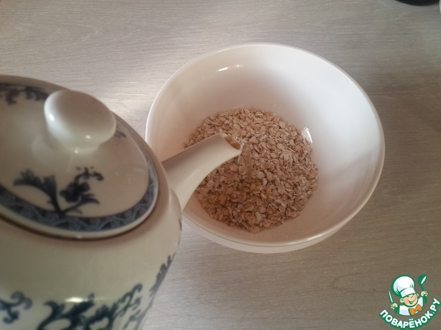Воду вскипятить и остудить до 60-70 градусов. Овсяные хлопья залить этой горячей водой и оставить на 1 час