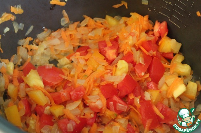 В сковороде разогреть оливковое масло, обжарить лук, добавить морковь и помидоры. Потушить 10-15 минут.