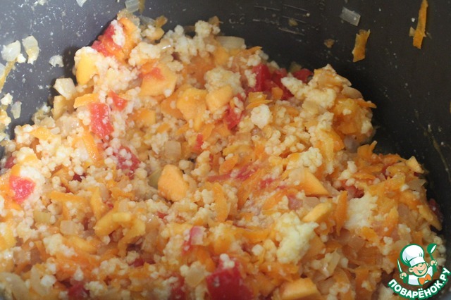 Удаленную мякоть мелко порезать и добавить к овощам. Туда же добавить пшено и приправы, потушить еще 10 минут. Добавить примерно 2/3 сыра и хорошо перемешать.