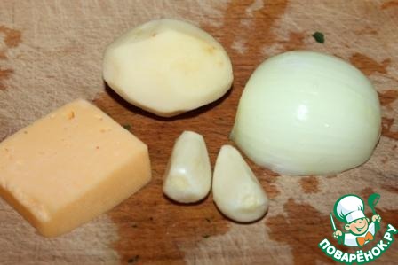Очищаем луковицу (у меня половинка т. к большая), чеснок и картофель.