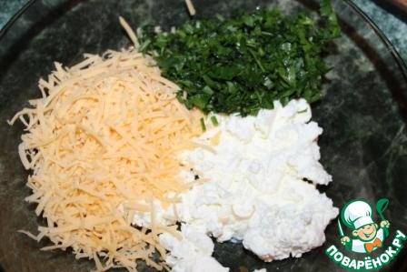 Для начинки смешиваем творог, тёртый сыр и порубленная зелень.
