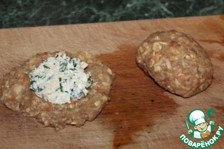 Отщипываем от фарша небольшой шарик, расплющиваем в лепёшку, на середину кладём начинку, защипляем края и формируем зразу.
