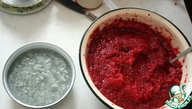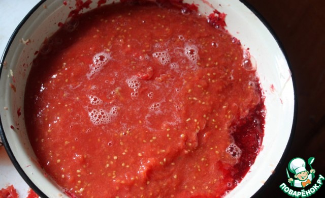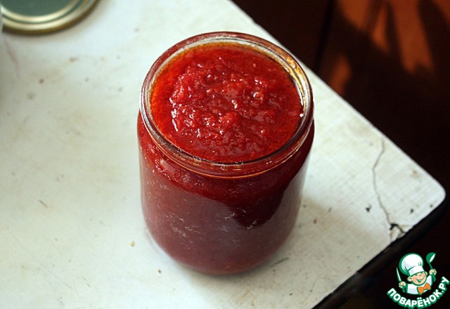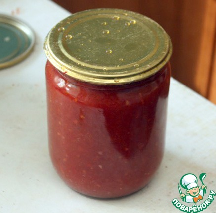 И пару кило перетёртых помидоров. Туда же 3 чайных ложки моего молотого перца. Но тут уж по вкусу. Кому-то поядрёнее надо, кому-то наоборот. Ещё добавляю столовую ложку соли и 4 столовых ложки сахара (сахар опционально - можно вообще не класть - это уже дело вкуса, но мне так нравится).