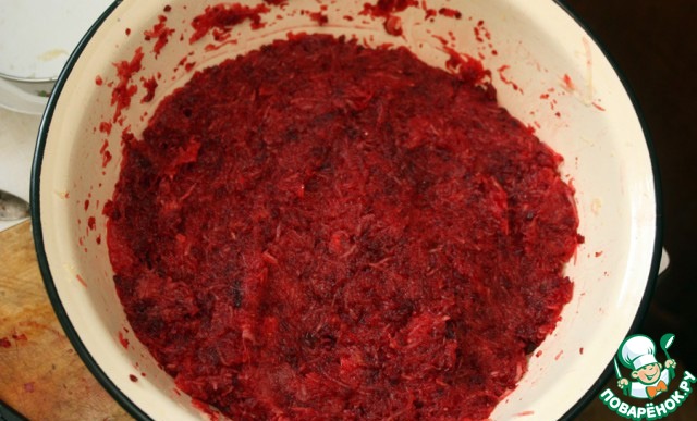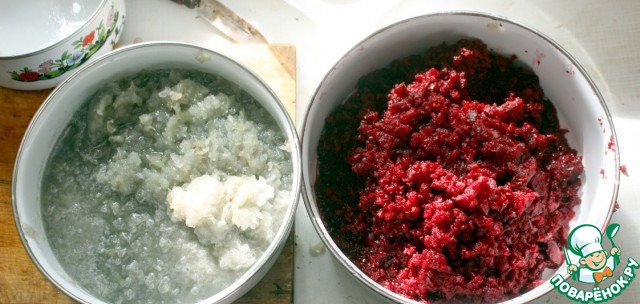 Лук и чеснок пропустил через мясорубку в одну тарелку, свёклу - в другую. Лук с чесноком залил половиной стакана 9% уксуса и пока поставил отдельно. Они нам будет нужен в самом конце приготовления. Пусть пока маринуются.