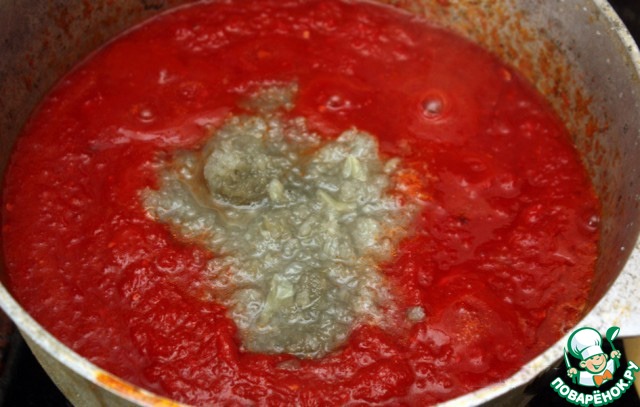 В казане (можно и в кастрюле, но надо постоянно помешивать, да и всё равно чуть-чуть, да пригорит - отмывать потом...) варим массу где-то пол-часа, после чего добавляем замариновавшуюся луко-чесночную смесь. Попутно ставим стерилизовать банки.