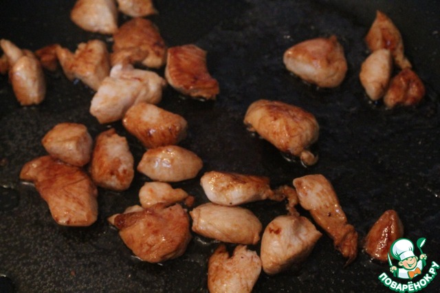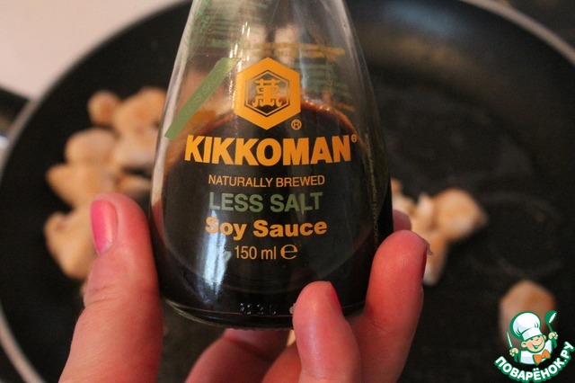 Выкладываем на сковороду с разогретым растительным маслом. Обжариваем 3 мин. Добавляем соевый соус Kikkoman.