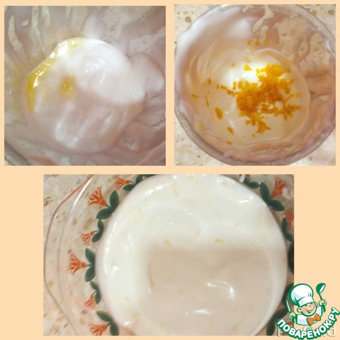 Глазомером делим на 3 части, в одну добавляем аккуратно сок (если боитесь, что опадут белки, можете не рисковать... у меня этот слой не самый "пышный", думаю из-за сока - вода ведь во взбитые белки не должна попадать) и цедру