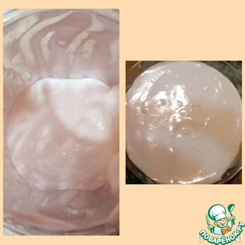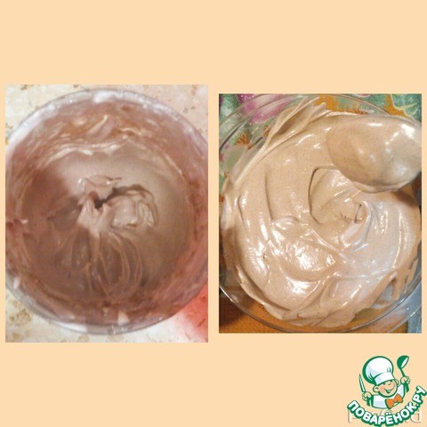 Во вторую часть добавляем какао и взбиваем (с какао прекрасно загустели белки... не знаю почему :)) Выкладываем сверху, ровняем