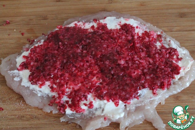 Куриное филе солим, перчим и посыпаем молотым чесноком. Творожный сыр равномерно размазываем.