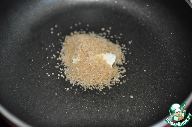 На сковороду кладём сливочное масло и коричневый сахар, растапливаем.