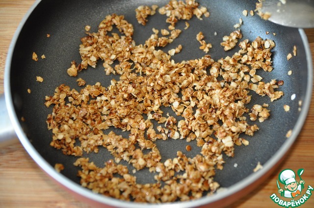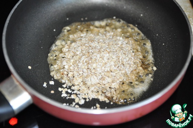 Сначала готовим карамелизированные овсяные хлопья. Рекомендую готовить побольше и хранить в закрытой стеклянной банке. Их можно добавлять к йогурту, мороженному и т. д.