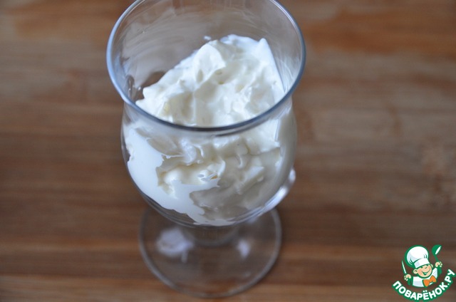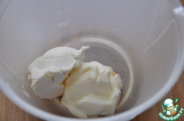 Берём творожный сыр и любой фруктовый йогурт, у меня грушевый с ванилью.