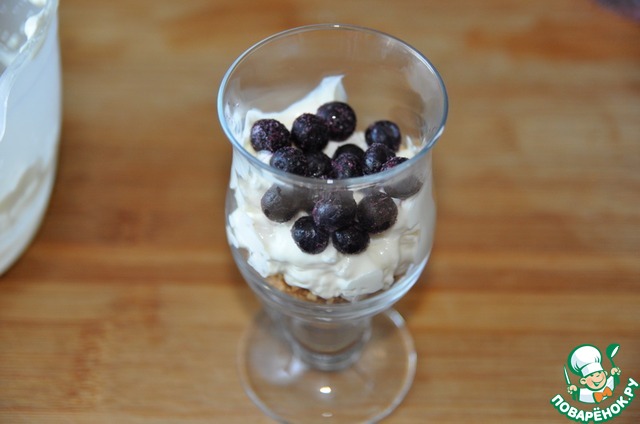 Далее кладём оставшийся творожный крем, карамелизированные хлопья и украшаем ягодками черники.