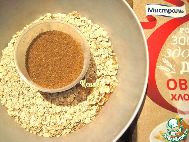 Приготовим хрустящую "панировку". Для это смешаем Овсяные хлопья и коричневый сахар от ТМ Мистраль. В качестве мерного стакана я использовала мульти-стакан объёмом 160 мл.