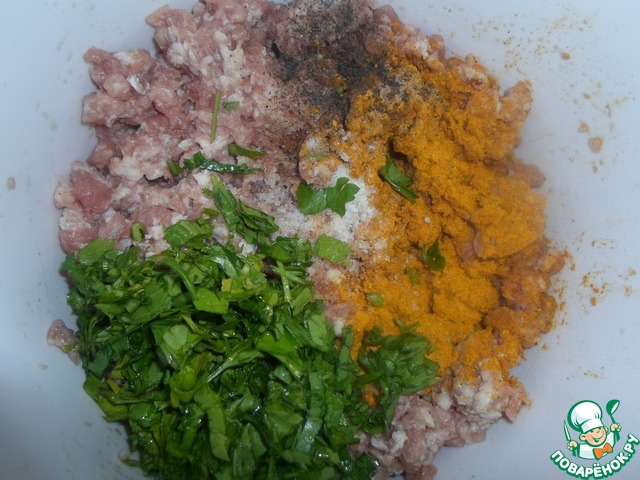 В фарш добавляем карри, перец, соль, зелень и перемешиваем.