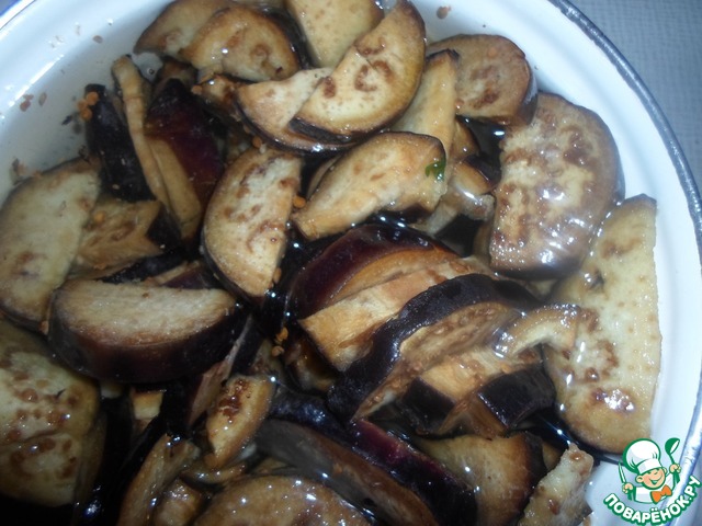 Баклажаны нарезаем на полукольца, заливаем холодной водой и оставляем на 20 минут (для того чтобы ушла горечь).