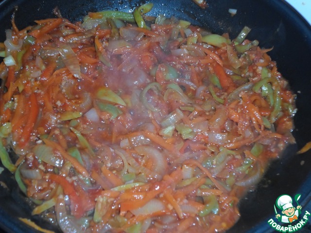 Затем добавляем томатную пасту и чеснок пропущенный через чеснокодавку (у меня был еще домашний томат, его я тоже добавила не много). Хорошо перемешиваем и пассируем еще 3-4 минуты.