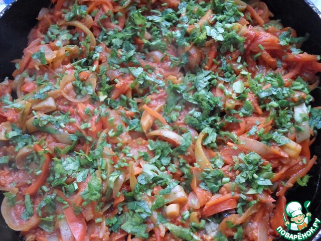 Блюдо при подаче обильно посыпаем мелко рубленной петрушкой.