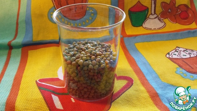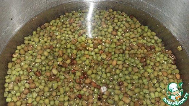 Маш перекладываем в кастрюльку, заливаем водой. Количество воды не принципиально, так как остатки потом всё равно сольём. Ставим на огонь, с момента закипания варим 30 минут. Потом выключаем, воду сливаем.