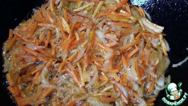 Обжариваем овощи на растительном масле. Масло можете взять любое любимое. Именно это блюдо я готовлю на настоящем подсолнечном масле холодного отжима. То есть на том единственном, которое продавали в советских магазинах. Масла можно добавить побольше, так как потом в кашу больше масло добавляться не будет.