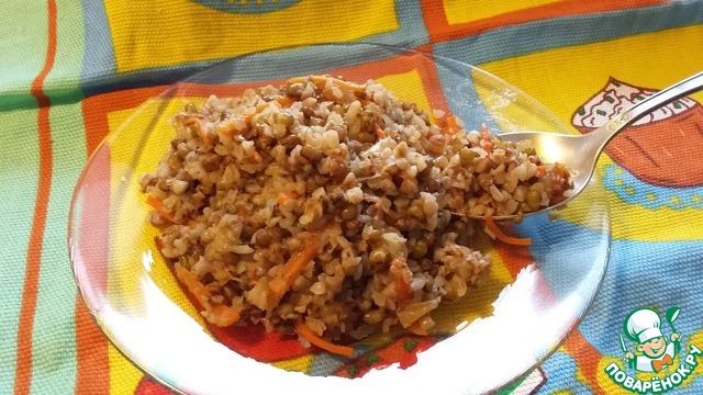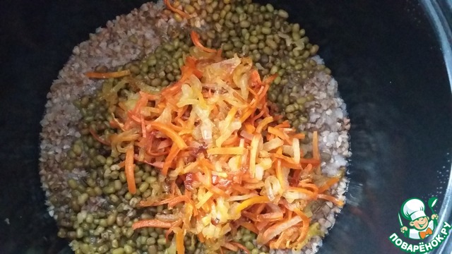 Гречку я готовлю в мультиварке. Когда я варю просто гречку, то на 1 стакан крупы беру 2 стакана воды и готовлю 20 минут на режиме «каша». Так как здесь у нас присутствует маш и овощи, то воды в гречку я вливаю 2 с половиной стакана, и готовлю 25 минут.