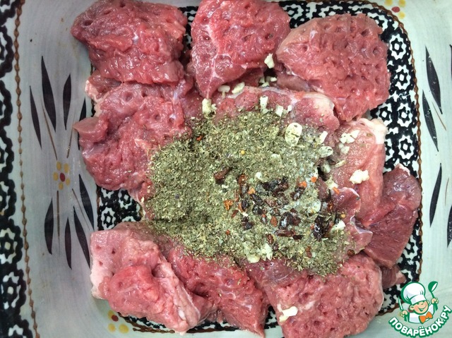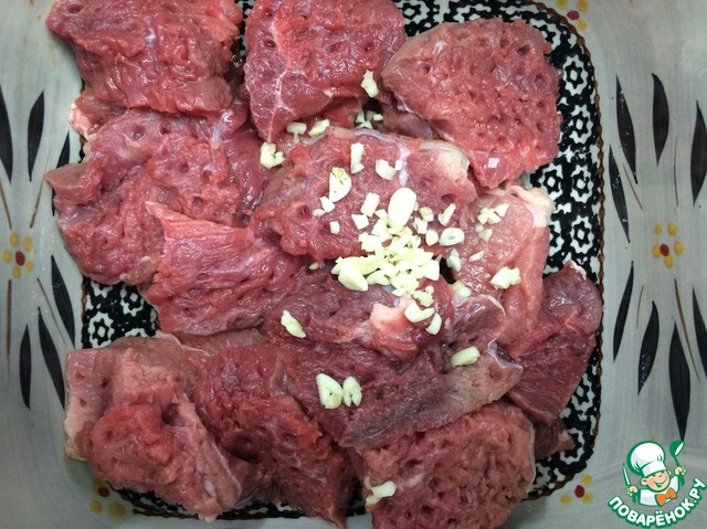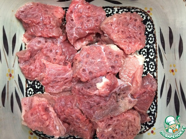 Нарезаем мясо средними кусочками, отбиваем. Перемещаем в керамическую посуду