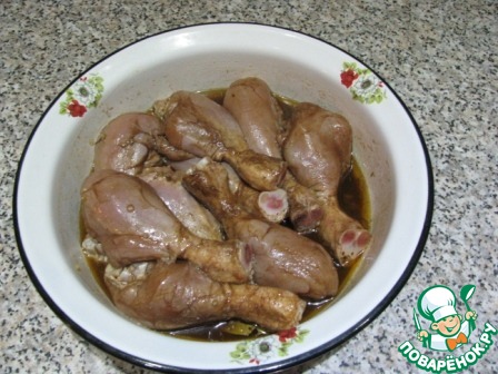 Приступаем к приготовлению. Курицу (в моем случае голени) вынимаем из маринада и выкладываем в чашу мультиварки. Поскольку в маринаде было масло, чашу я не смазываю. Оставшийся маринад выбрасываю.
