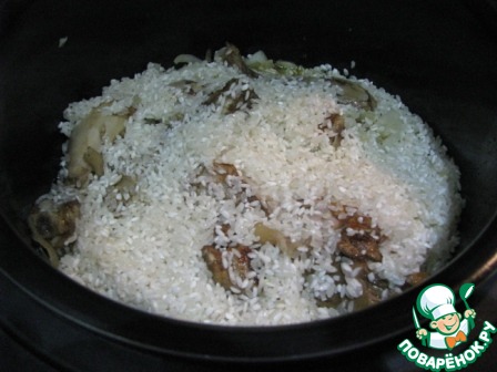 Через 10 минут перемешиваем лук с мясом и засыпаем промытый рис.