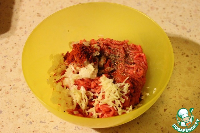 В фарш добавить чеснок пропущенный через пресс, лук, перец, тимьян, паприку.