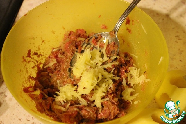 Серединки 2х картофелин натереть на мелкой терке и добавить в фарш. Перемешать.